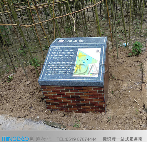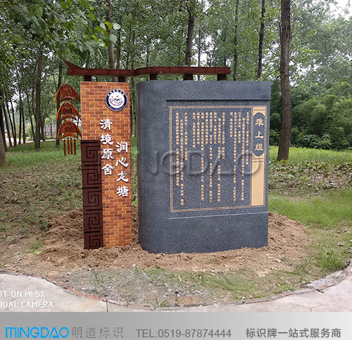 特色鄉(xiāng)村導視牌,這套鄉(xiāng)村景區(qū)標識包括景點解說牌、路徑指示牌、導游線路平面圖牌等標識。在設計上這套美麗鄉(xiāng)村標識牌以真石漆工藝和磚紋造型更好的體現(xiàn)村落的古樸特色和田園氣息,在裝飾上明道以魚造型的木雕豐富了標識牌的內容和表現(xiàn)力,使整套標識牌更形象的反映了堆上組村的地方特色,也使這套標識牌更富趣味性、融于環(huán)境。