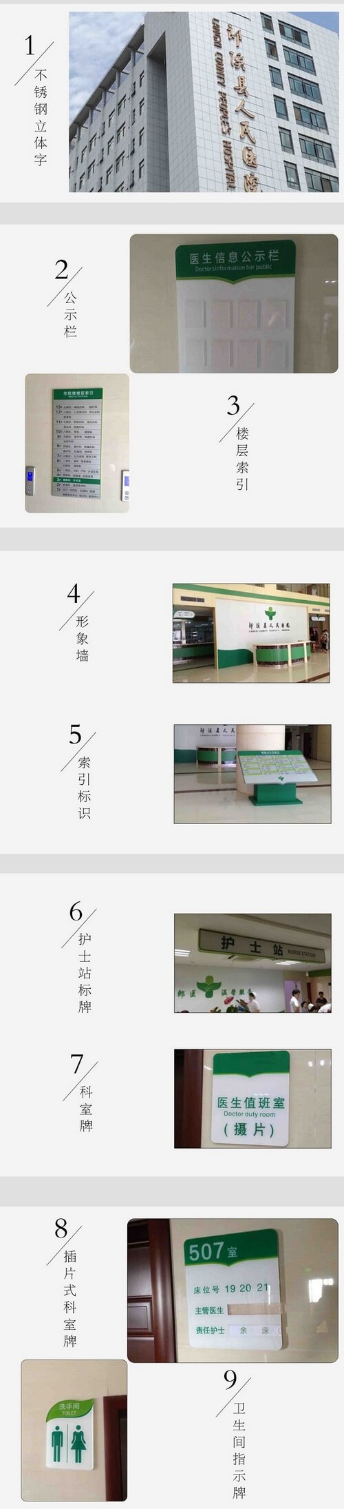 設計最根本的特點在于人性化關懷的體現,同時也是將專業性極強的醫療信息簡化的過程。明道標識在為郎溪人民醫院建立整體標識系統時,以純白的底配鮮綠色字,標牌造型簡潔、美觀、大氣、現代化,讓病人不僅能夠清晰的了解醫院的科室方位,而且給與病人及家屬一種健康、整潔、安全的視覺感。