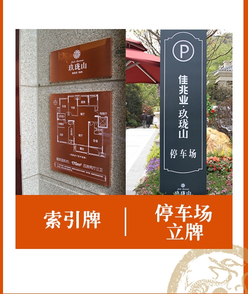 明道標識承接了玖瓏山項目的標識系統設計制作和施工,針對于該樓盤典雅復古、莊重大氣的設計風格,明道標識在設計標識系統時,采用穩重的藍灰色為主色調,營造出鮮明的精致貴族氣息,與樓盤設計風格一脈相承,交相輝映。