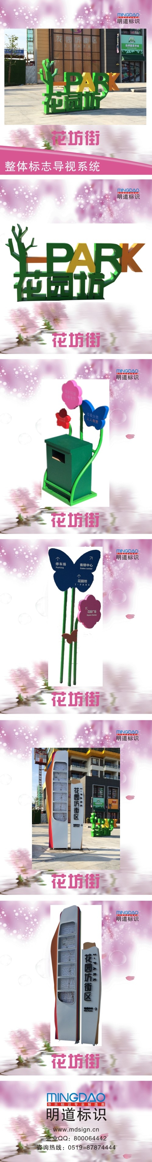 明道標識設計的花園坊社區商業街標識系統主要包括:主題招牌,精神堡壘,多向指示牌,環衛垃圾箱等。