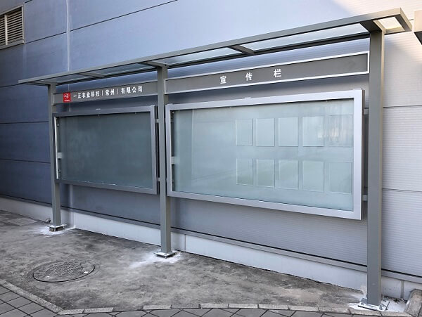 常州明道標識為客戶制作的這款企業宣傳欄設計簡潔大方,實用性強,性價比高。安裝完成后,得到客戶的一致好評。